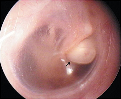 患先天性胆脂瘤的患者,鼓膜正常,因此早期往往很难被发现,直到出现听力下降时才会到医院就诊,如果耳内镜检查发现鼓膜后有白色的团块影则基本可以确诊(图1)。