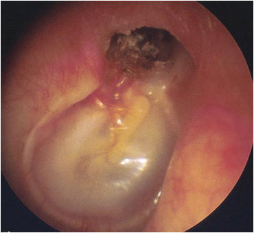后天继发性胆脂瘤常发生在鼓膜边缘性穿孔的患者,由于外耳道上皮沿穿孔缘长入鼓室所致(图3),患者出现症状早,常表现为耳流脓和听力下降;